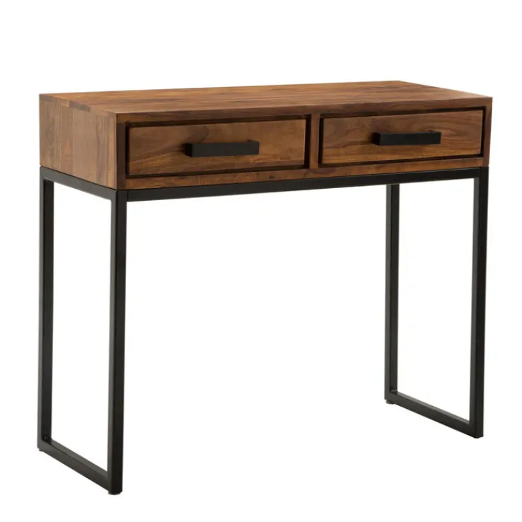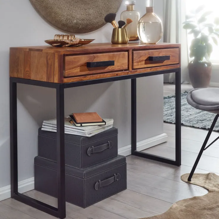 Am Konsolentisch 90 x 77 cm Sheesham braun schwarz steht stabil sowie in luftiger Optik auf einer Konsole aus schwarz pulverbeschichtetem Vierkant-Edelstahl. Er ist 36 cm tief, wiegt mit zwei Schubladen 18 kg und kann bis 40 Kilogramm belastet werden.