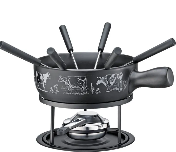Das Set setzt sich aus einem hochwertigen Fondue-Topf mit einem Durchmesser von 22 cm, einem Rechaud mit Untersatz, einem Patenbrenner und sechs Käsefonduegabeln an. Der Topf besteht aus feuerfester Keramik und aus hochwertigem Edelstahl. Er hat eine zylindrische Form und zeigt sich mit einer klassischen schwarzen Oberfläche. Abgerundet wird das Design durch die aufgemalten Kühe, die sich in Weiß kontrastreich von dem dunklen Topf von KÜCHENPROFI abheben. Dieser eignet sich für alle Herdarten, außer für Induktion.