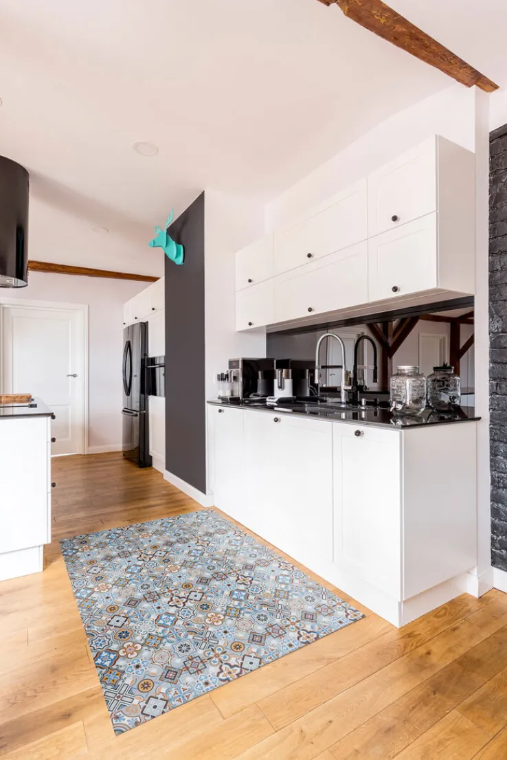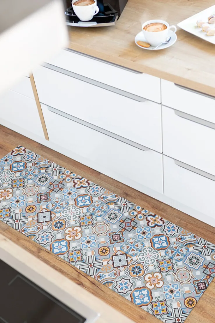 Der rechteckige Küchenteppich MARRAKESCH besteht aus reinem Polyvinylchlorid und ist dadurch perfekt wie häufig genutzte Bereiche wie die Küche geeignet. Durch das Material ist der Teppich nicht nur robust und strapazierfähig, sondern auch wärmedurchlässig und dadurch für Böden mit integrierter Fußbodenheizung optimal geeignet. Zusätzlich ist der Küchenläufer sehr pflegeleicht. Das Highlight des Teppichs ist jedoch sein angesagter Retro-Look, der an Fliesen erinnert, und der Küche im Handumdrehen ein freundliches Ambiente verleiht.
