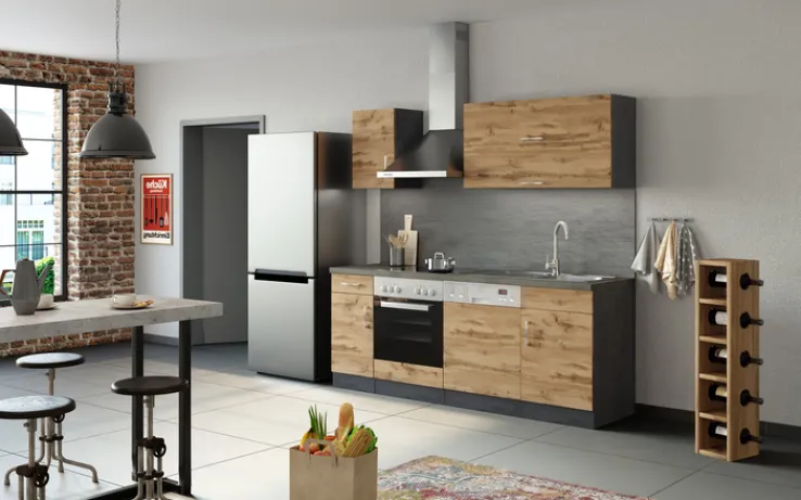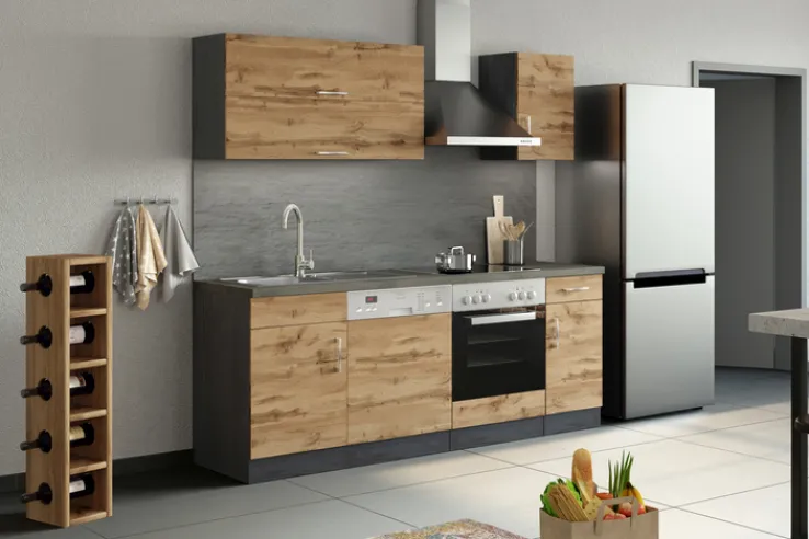 Die Küchenzeile ODENSE ist 210 cm breit, 60 cm tief und 200 cm hoch. Die Fronten sind aus Wotan Eiche Dekor, Sockel und Arbeitplatte aus Holznachbildung in Anthrazit.