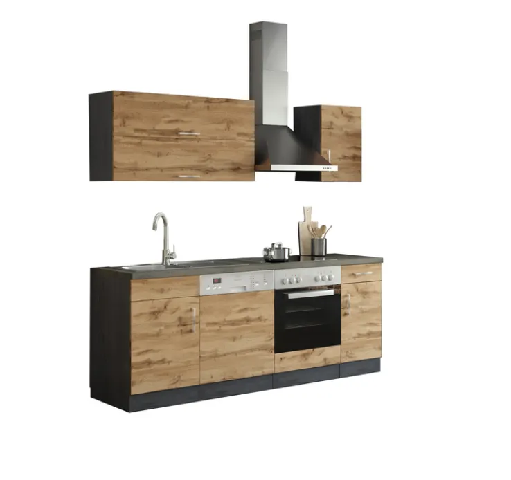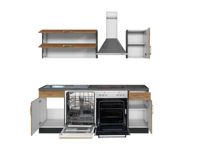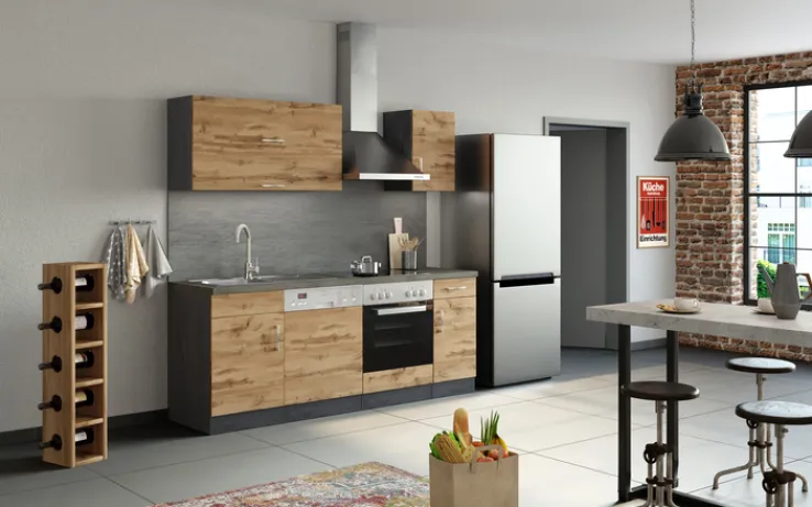 Perfekt für junge Haushalte: Zu der Küchenzeile ODENSE gehören Kochfeld und Backofen, Dunstabzugsesse und Geschirrspüler. Das schlichte Design im modernen Naturlook wird durch den farblich abgesetzten Sockel, die Arbeitsplatte in Anthrazit und minimalistische Metallgriffe unterstrichen. Bei der Küchenzeile Made in Germany überzeugen leicht laufende Schubladen, die praktische Einteilung mit Einlegeböden und die Qualität. Hier macht Kochen richtig Spaß. Die passenden Kühlgeräte können nach eigenen Wünschen gekauft werden. Die Lieferung der Küchenzeile erfolgt zerlegt.