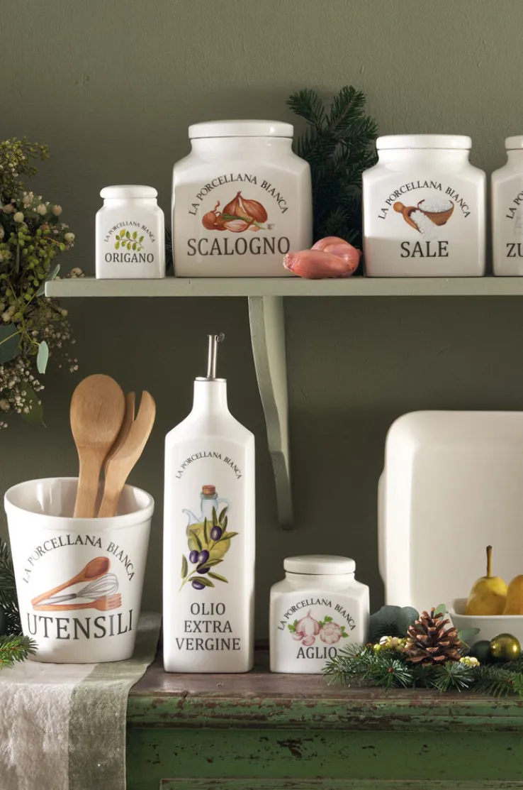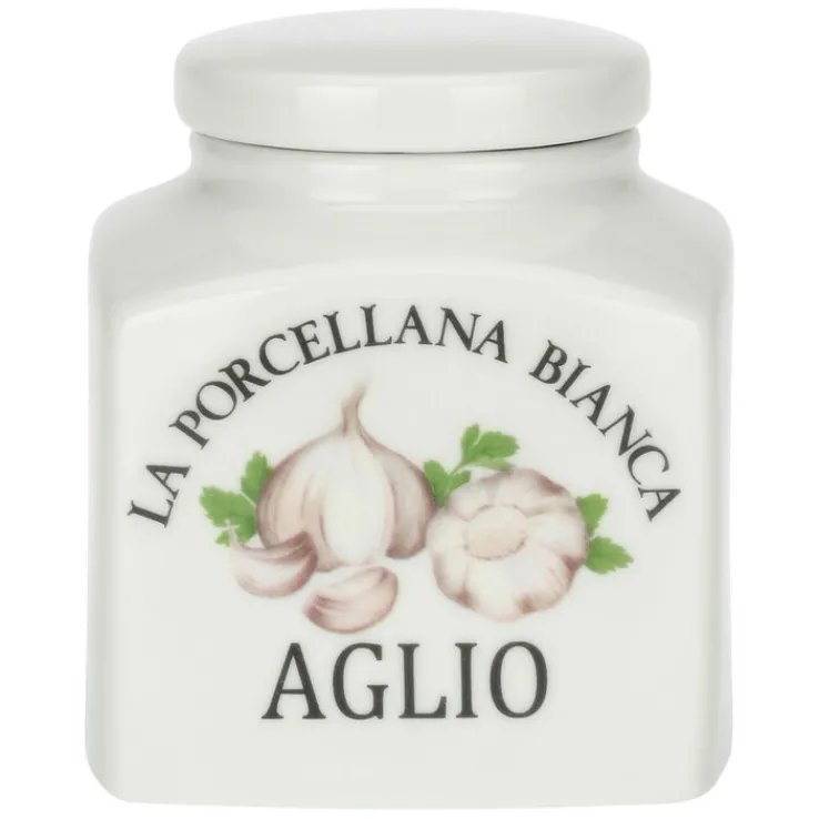 Die Aufbewahrungsdose CONSERVA Aglio ist 10,5 cm hoch und besteht aus Porzellan in Weiß. Als Motiv ist unter anderem der Begriff „Aglio“ zu sehen.