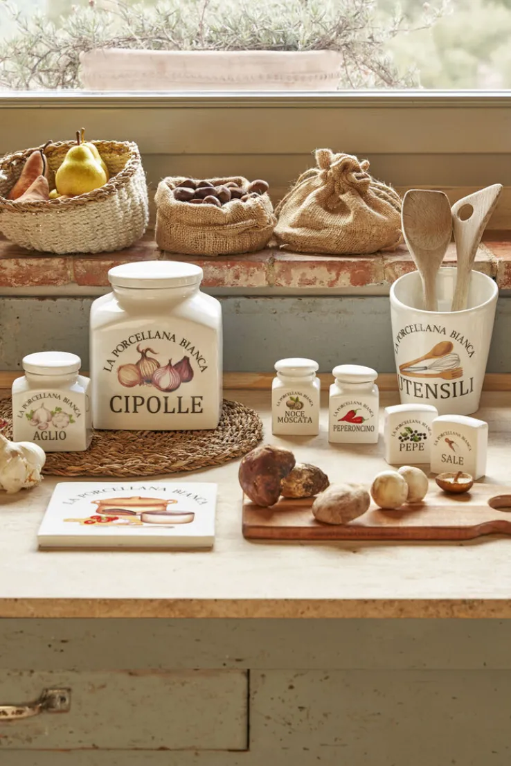 Aglio ist der italienische Name für Knoblauch. Über diesem Wort sind Knoblauchknollen zu erkennen, darüber wölbt sich der Schriftzug „La Porcellana Bianca“. Dieser steht für den italienischen Hersteller. Die schöne weiße Dose CONSERVA kann für Knoblauch, aber auch für andere Zwecke verwendet werden. Wer allerdings schon einmal Knoblauch eingefüllt hatte, sollte sie gründlich reinigen, bevor andere Lebensmittel hineingegeben werden. Wie gut, dass die Dose für die Spülmaschine geeignet ist. Ihr Porzellandeckel schließt den Inhalt sicher ein und hält ihn frisch. Die Dose gibt es auch in weiteren Ausführungen.