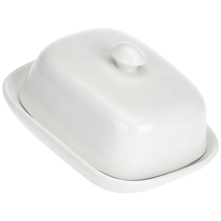 Lassen Sie sich von der attraktiven Butterdose TERRINE begeistern. Sie ist in rechteckiger Form mit einem Maß von 14 x 11 cm gestaltet, jedoch mit weich abgerundeten Kanten und einem hübschen, bedienfreundlichen Knopf auf dem Deckel. So wird die Butter auch auf gefällige Art präsentiert. Die Butterdose besteht aus zwei Teilen, dem eigentlichen Buttergefäß und einem schützenden Deckel. Das Ensemble ist ideal zur Aufbewahrung im Kühlschrank geeignet, die geruchsempfindliche Butter wird vor Verunreinigungen geschützt und bleibt länger frisch. Das Buttergefäß ist sehr pflegeleicht, da es spülmaschinenfest ist.