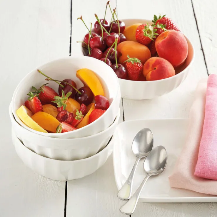 Die Schale PIEVE aus weißem Porzellan hat einen Durchmesser von 22 cm. Die runde Schale ist mikrowellenfest und lässt sich in der Spülmaschine reinigen.
