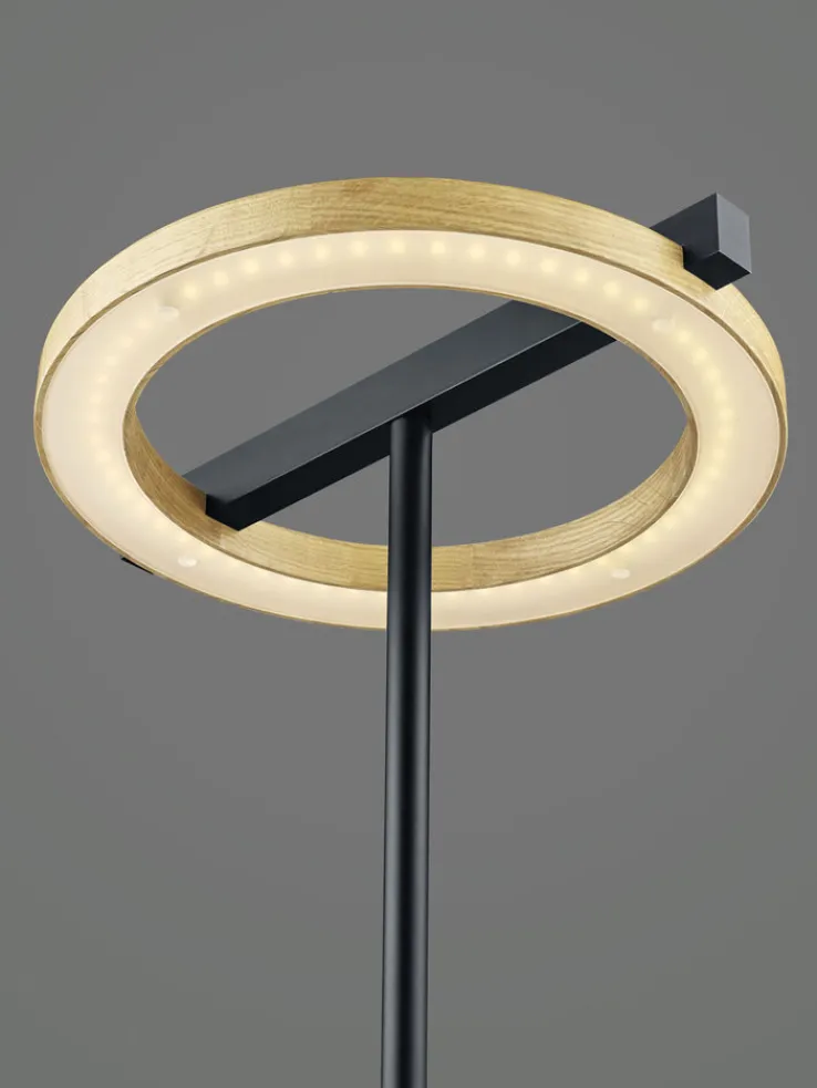 Die LED-Stehlampe der Serie NELLA vereint modernes Design mit funktionaler Beleuchtung. Mit einer Höhe von 182 cm und einem Durchmesser von 50 cm fügt sich die Lampe harmonisch in verschiedene Wohnräume ein. Die Hauptfarben Braun und Schwarz verleihen der Lampe eine elegante Optik, die durch die Kombination aus Holz und Metall unterstrichen wird. Der runde Lampenschirm aus Holz sorgt für eine warme Ausstrahlung, während der schwarze Metallfuß Stabilität bietet.