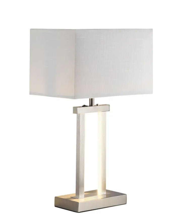 Die LED Tischlampe aus der Serie DOMO vereint modernes Design mit funktionaler Beleuchtung. Mit einer Breite von 32 cm, einer Höhe von 55 cm und einer Tiefe von 20 cm passt sie ideal auf jeden Tisch. Die Hauptfarbe der Lampe ist silberfarbig, ergänzt durch einen weißen, textilen Lampenschirm, der für eine angenehme Lichtverteilung sorgt. Das Gestell aus Metall und Kunststoff verleiht der Lampe Stabilität und eine zeitgemäße Optik. Die Lampe verfügt über eine E27-Fassung für AGL/Retrofit-Leuchtmittel, die nicht im Lieferumfang enthalten sind, sowie zwei fest eingebaute LEDs. Der Energieverbrauch der LEDs beträgt 6 W, während die maximale Lichtleistung der gesamten Leuchte 960 Lumen erreicht. Die Lampe ist dimmbar und mit einem Tastdimmer ausgestattet, was eine flexible Anpassung der Lichtintensität ermöglicht. Mit der Schutzart IP20 ist sie für den Einsatz in Innenräumen geeignet.