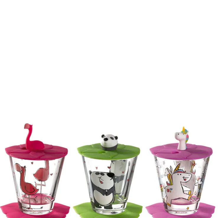 Auf dem Glas sind zwei Flamingos in Rot sowie mehrere kleine Herzchen abgebildet. Darüber hinaus besitzt das Glas eine klassische konische Form und bietet ein Fassungsvermögen von 120 ml. Er besteht aus hochwertigem Klarglas, ist lebensmittelecht und für die Reinigung in der Spülmaschine geeignet. Er kommt beispielsweise für Säfte, Milch, Wasser und andere Kaltgetränke infrage. Gerne kann das Glas mit dem passenden Deckel BAMBINI FLAMINGO kombiniert werden. Dieser passt nicht nur von der Größe, sondern auch mit seinem Design hervorragend zu den stilvollen Gläsern.