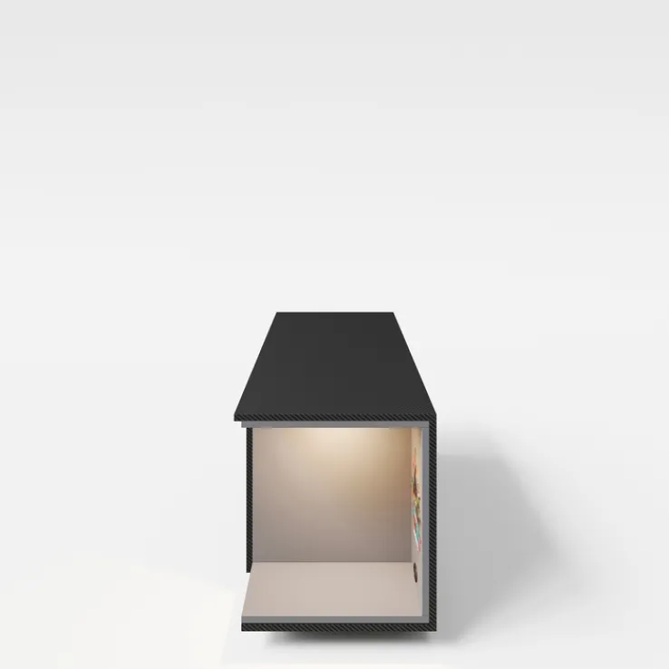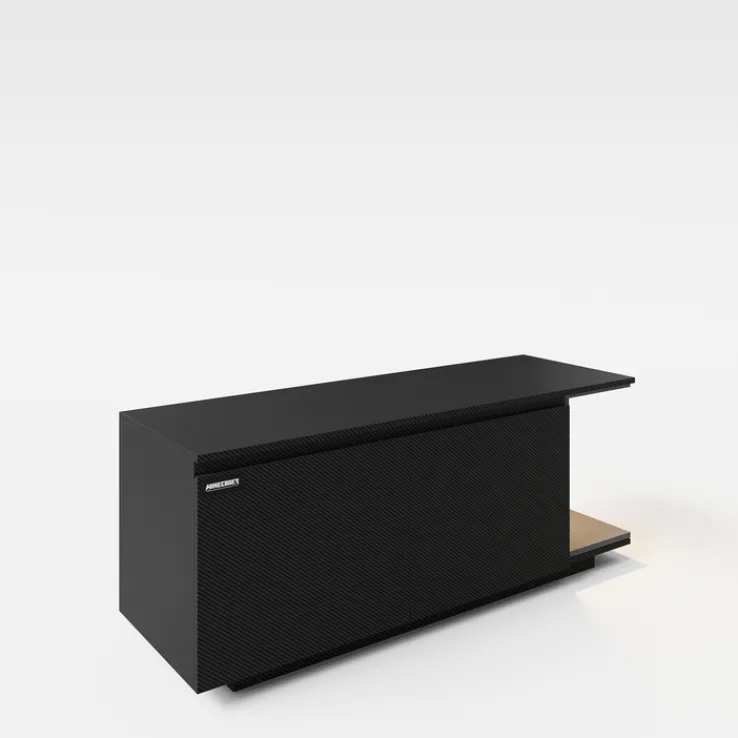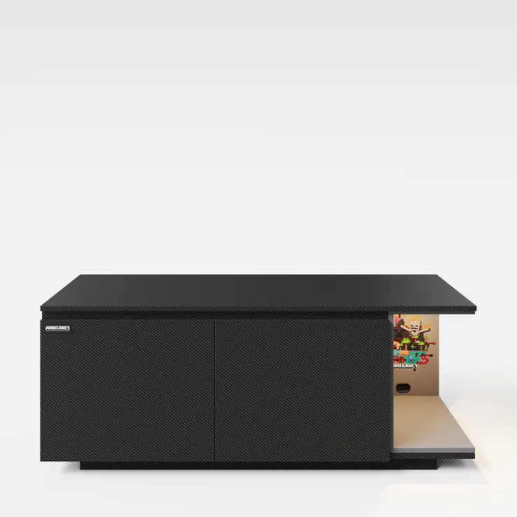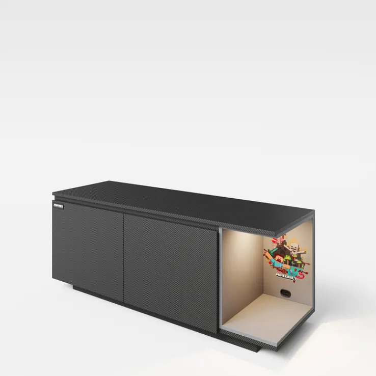 Eine Besonderheit des Lowboard MINECRAFT 125 cm ist die Carbon-Optik. Auf der rechten Seite befindet sich ein offenes Fach mit Beleuchtung. Diese strahlt von oben auf und Boden Rückwand. Letztere zeigt eine MIECRAFT-Collage mit den bekannten Spielcharakteren. Das Fach bietet sich als Ablage für eine Konsole an. Es verfügt über eine Kabeldurchführung. Viel Stauraum verbirgt sich hinter den beiden grifflosen Drehtüren. Der Korpus ist aus Spanplatte (MDF) gefertigt und mit Melaminharz beschichtet. Das Gesamtgewicht dieses MINECRAFT Lowboard beträgt 29 kg.