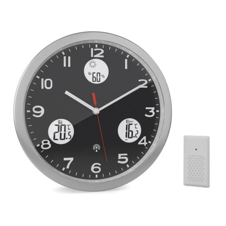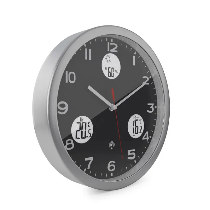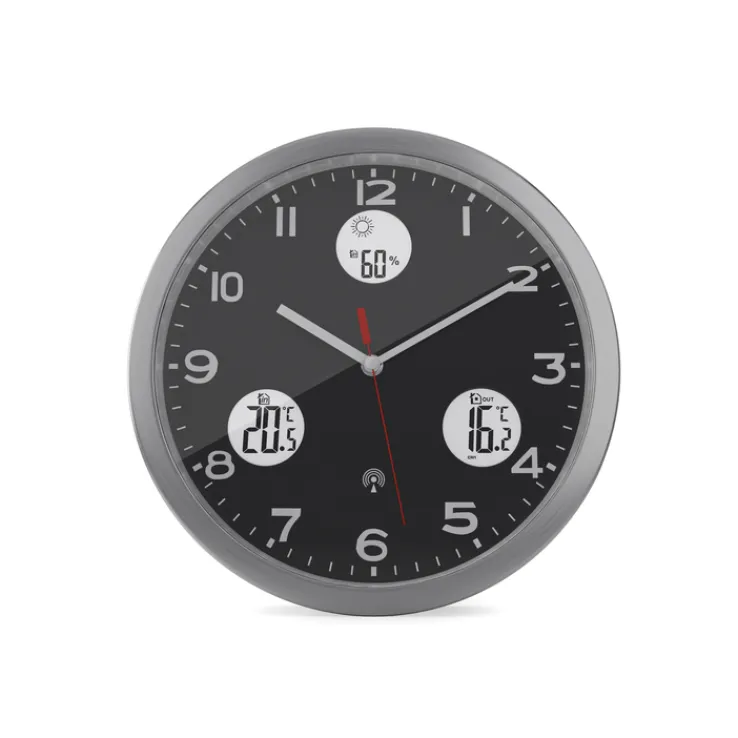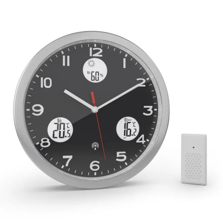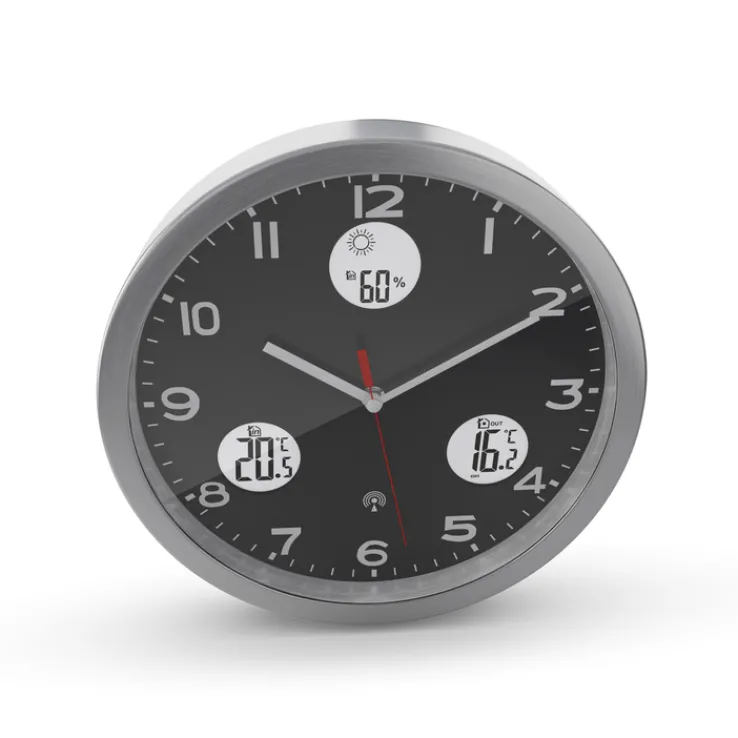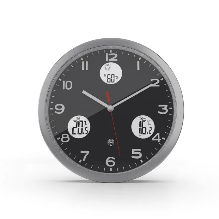 Neben der klassischen Zeitanzeige verfügt die Uhr über drei separate Digitaldisplays. Diese zeigen die Innen- und Außentemperatur sowie die Luftfeuchtigkeit an.