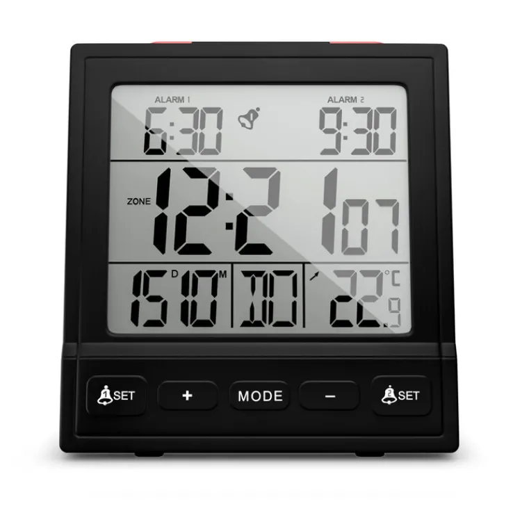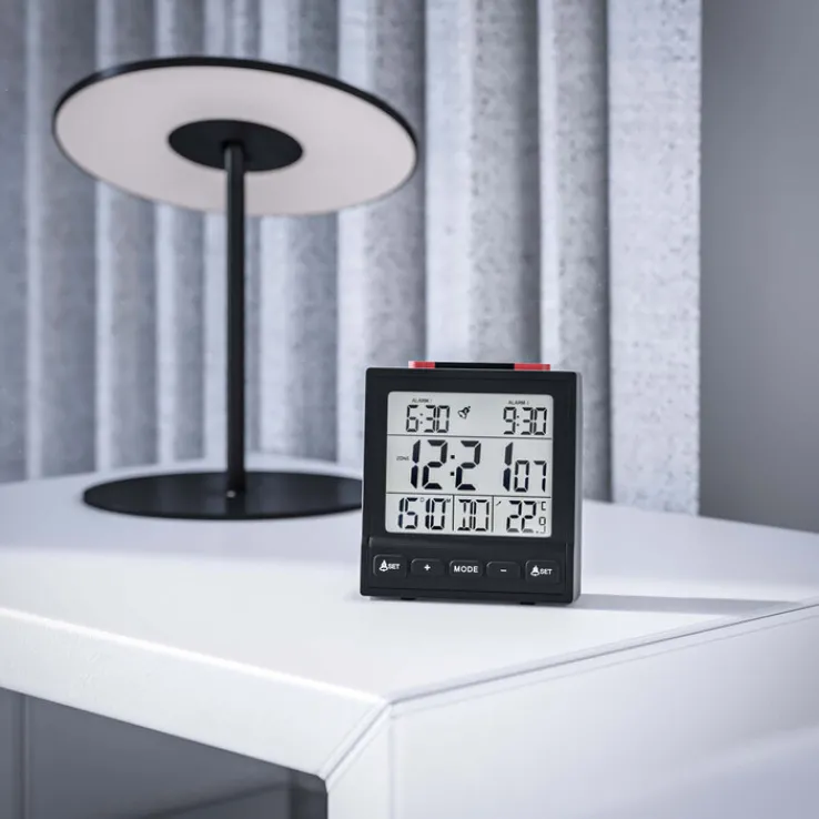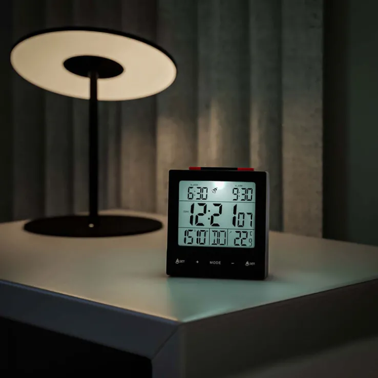 Der moderne Funkwecker von Mebus ist eine Bereicherung für den geschmackvoll eingerichteten Schlafbereich. Durch das stilvolle Design passt der Wecker mit 12- und 24-Stunden-Anzeige in der Farbe Schwarz auf die Nachtkonsole. Es stehen zwei einstellbare Alarme zur Verfügung. Ein Innenthermometer in C° oder F° ist ebenfalls integriert. Der Funkwecker ist durch seine kompakte Form auch für den Urlaub oder die Geschäftsreise ideal.