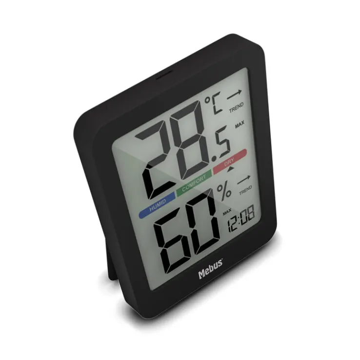 Die Mebus Klimastation ist ein digitales Thermo-/Hygrometer für Innenräume und von °C auf °F umschaltbar. Es bietet neben der Anzeigen von Temperatur und Feuchtigkeit eine Uhranzeige sowie einen Raumklima-Indikator. Durch die große Komfortanzeige und die Displaybeleuchtung sind die Daten sehr gut erkennbar. Für den Betrieb der Klimastation sind zwei AA oder AAA-Batterien notwendig. Die Klimastation punktet außerdem mit einem schlichten modernen Design, das mit praktisch jedem Einrichtungsstil harmoniert und ist somit für jeden Wohnraum geeignet.