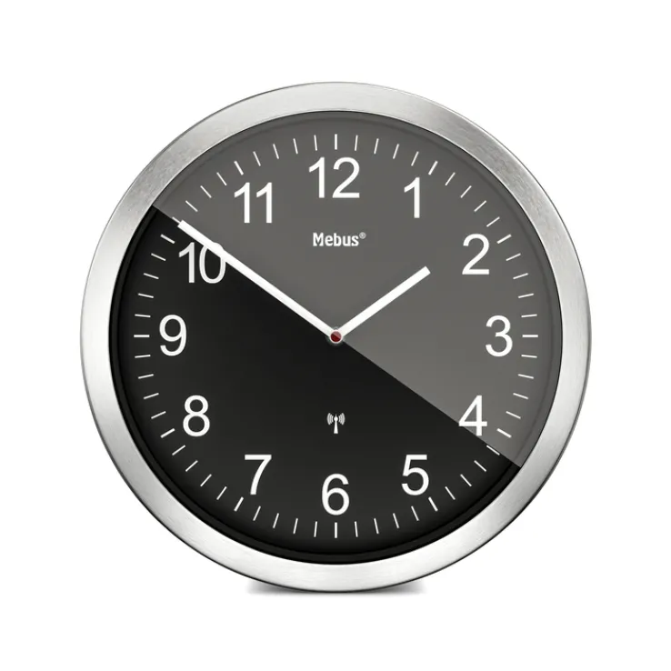 Diese moderne Wanduhr verfügt über ein rundes Gehäuse mit einem Durchmesser von 45 cm.