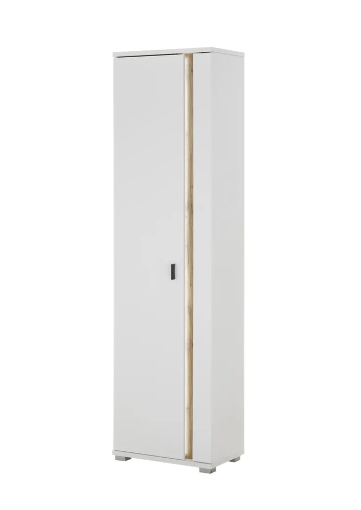 Schrank verfügt über eine Drehtür und vier Einlegeböden, die eine flexible Organisation ermöglichen. Die Soft-Close-Funktion sorgt für ein geräuschloses Schließen der Tür, während der Griff in Silberfarbe einen modernen Akzent setzt. Gefertigt aus Holznachbildung, bietet der Schrank eine robuste und pflegeleichte Oberfläche.