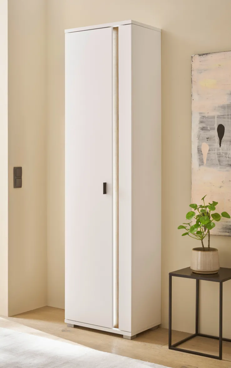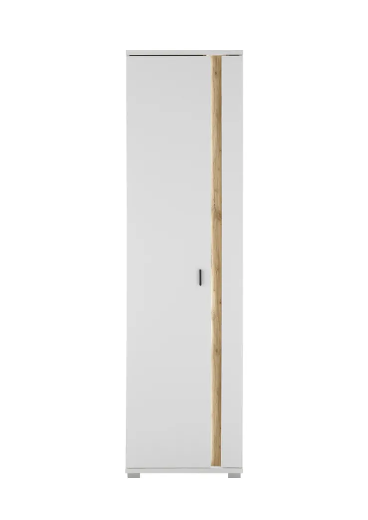 Der Schrank ist in einem ansprechenden Weiß gehalten, das durch Akzente in Eiche Wotan ergänzt wird, was ihm eine natürliche und warme Ausstrahlung verleiht. Die Kombination aus Weiß und Eiche passt sich nahtlos in unterschiedliche Wohnstile ein. Der