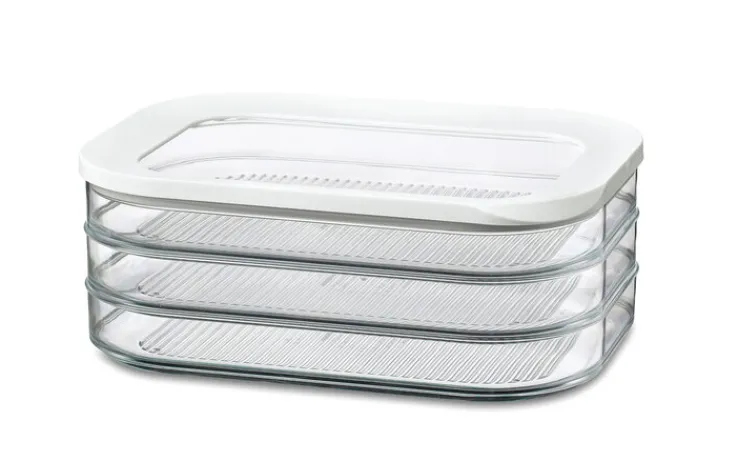 Die mepal Kühlschrankdose MODULA bietet drei Fächer, die sich übereinander stapeln lassen. So ist eine besonders platzsparende Lagerung im Kühlschrank möglich. Die Box und der Deckel sind aus Kunststoff gefertigt und können einfach in der Spülmaschine gereinigt werden. Da die einzelnen Fächer transparent sind, können Sie selbst im geschlossenen Zustand immer sehen, was sich darin befindet. Das Design ist relativ schlicht, sodass sich die Kühlschrankdose wunderbar in fast jede Küche integrieren lässt.