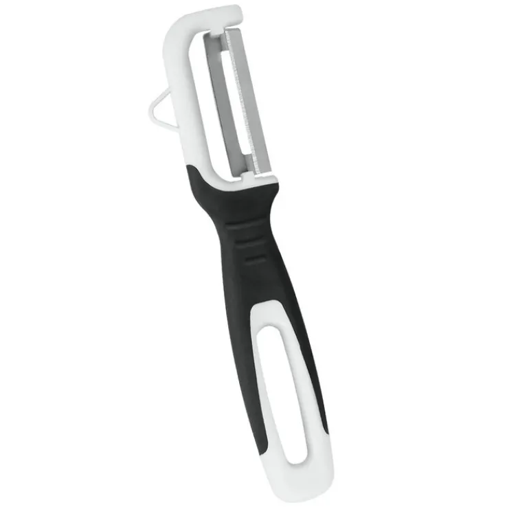 Der metaltex Sparschäler bringt mit seinem auffälligen Design in Schwarz und Weiß Abwechslung in die Küche. Gleichzeitig überzeugt er durch eine rostfreie Inox-Klinge, die beweglich gelagert ist. Der Aufbau des Sparschälers ermöglicht es, Obst und Gemüse schnell und verlustarm zu schälen. Beim Schälen größerer Mengen Spargel, Karotten oder Kartoffeln macht sich die Zeitersparnis gegenüber dem Schälen mit einem Messer deutlich bemerkbar.