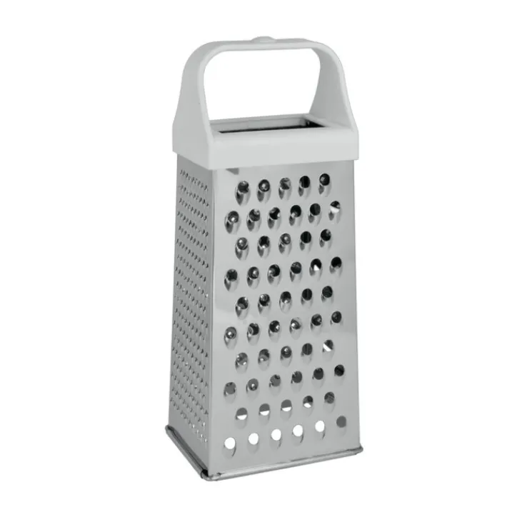 Die silberfarbige Vierkant-Reibe mit weißem Kunststoffgriff misst eine Länge von 10.5 cm, eine Breite von 8 cm und eine Höhe 24.5 cm. Die scharfen Reibeflächen wurden aus dem langlebigen Edelstahl Inox gefertigt. Er ist rostfrei und pflegeleicht sowie säure- und korrosionsbeständig. Der weiße Tragegriff wurde aus dem robusten Kunststoff Acrylnitril-Butadien-Styrol (ABS) hergestellt und zeichnet sich durch eine hohe Oberflächenhärte aus. Dadurch ist der Griff stabil und schlagfest.