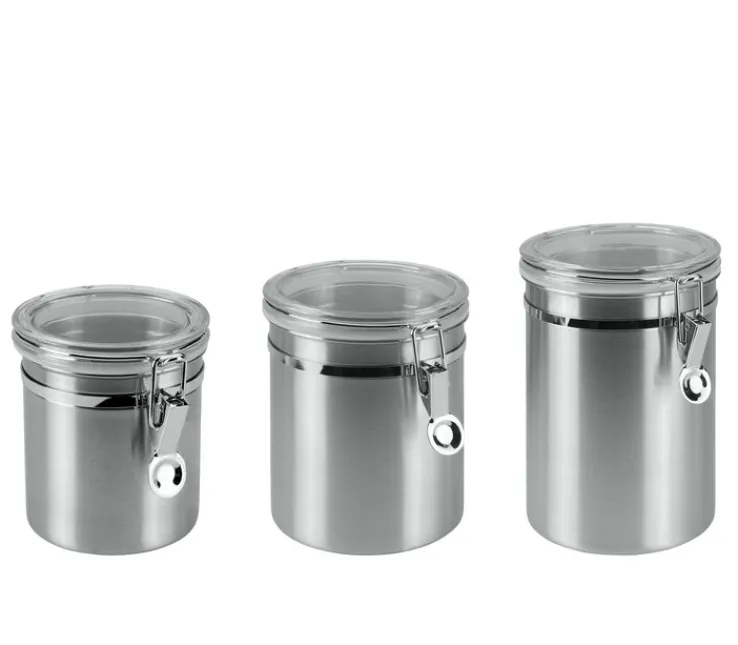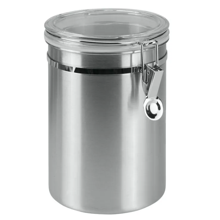 Die Vorratsdose und der hochwertig verarbeitete Bügelverschluss bestehen aus rostfreiem Edelstahl. Die Innen- und Außenseite der Dose sind matt gebürstet. Das verwendete Metall ist lebensmittelecht und säurebeständig. Der Deckel der Vorratsdose ist aus Acryl gefertigt.