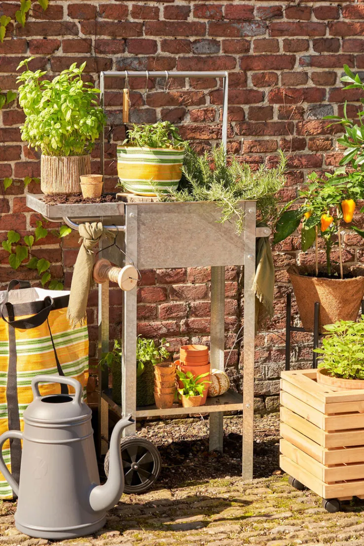 Mit seiner kompakten Größe kann der Pflanztisch auch bei geringen Platzverhältnissen auf der Terrasse und sogar auf einem Balkon zum Einsatz gebracht werden. Er wird massiv aus Eisen in einer schweren Ausführung hergestellt, hat somit einen sicheren Stand und lässt sich durch seine beiden Räder bequem an jeden Wunschort transportieren.