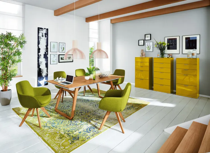 Die genaue Bezeichnung des Farbtons hört auf den Namen Florida Kiwi. Die Sitzhöhe beträgt 48 Zentimeter, die weiteren Maße sind 86 x 62 x 66 Zentimeter (Höhe x Breite x Länge). Als Materialien wurden für den Stuhl massive Eiche sowie eine robuste und schmutzabweisende Synthetikfaser verwendet. Zum dem Stuhl passende Esstische gibt es ebenfalls in unserem Onlineshop.