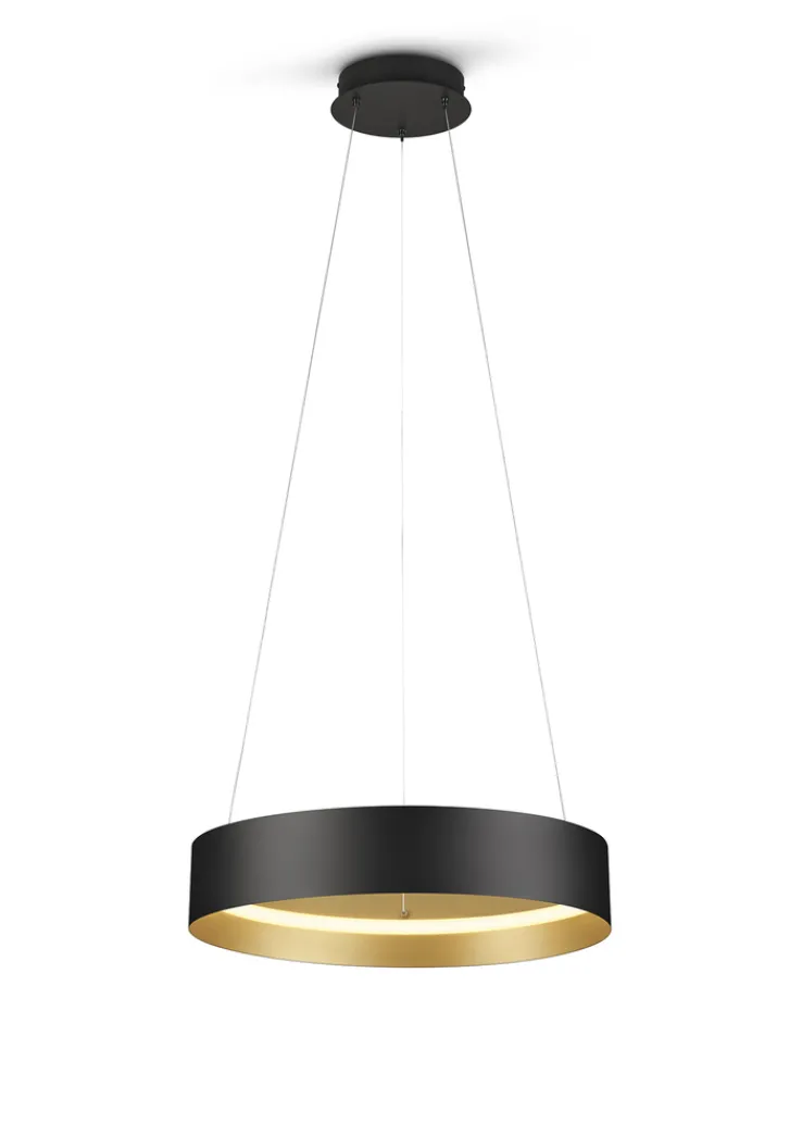 Die schwarz- und goldfarbige LED Pendelleuchte MR LOOP von Musterring ist eine stilvolle Beleuchtung für den modern eingerichteten Wohn- oder Essbereich. Durch das moderne Design lässt sich die Leuchte mit einem Durchmesser von 50 cm einfach integrieren. Ausgestattet mit einem Sensordimmer, einer Lichtfarbverstellung (CCT) und einer Memory-Funktion sorgt die Pendelleuchte stets für das passende Licht und schafft ein gemütliches Ambiente.