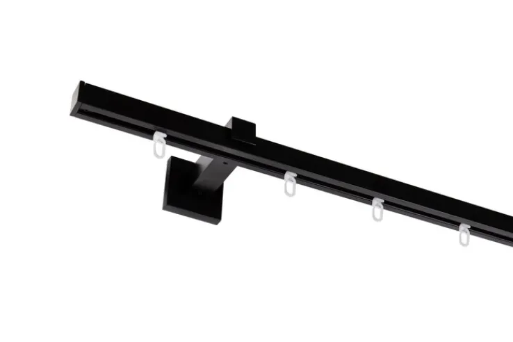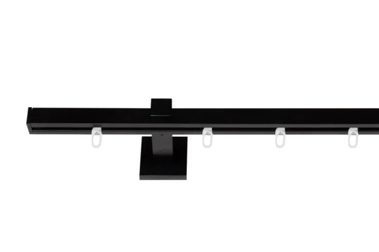 Die schwarzlackierte Innenlauf-Komplettgarnitur, gefertigt aus Aluminium, ist 240 cm lang. Was zur Montage einer modernen Gardinenstange nötig ist, enthält diese Garnitur.