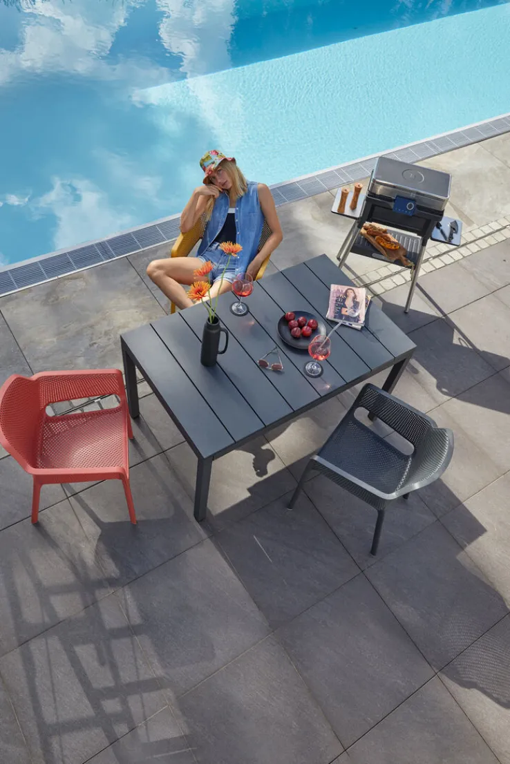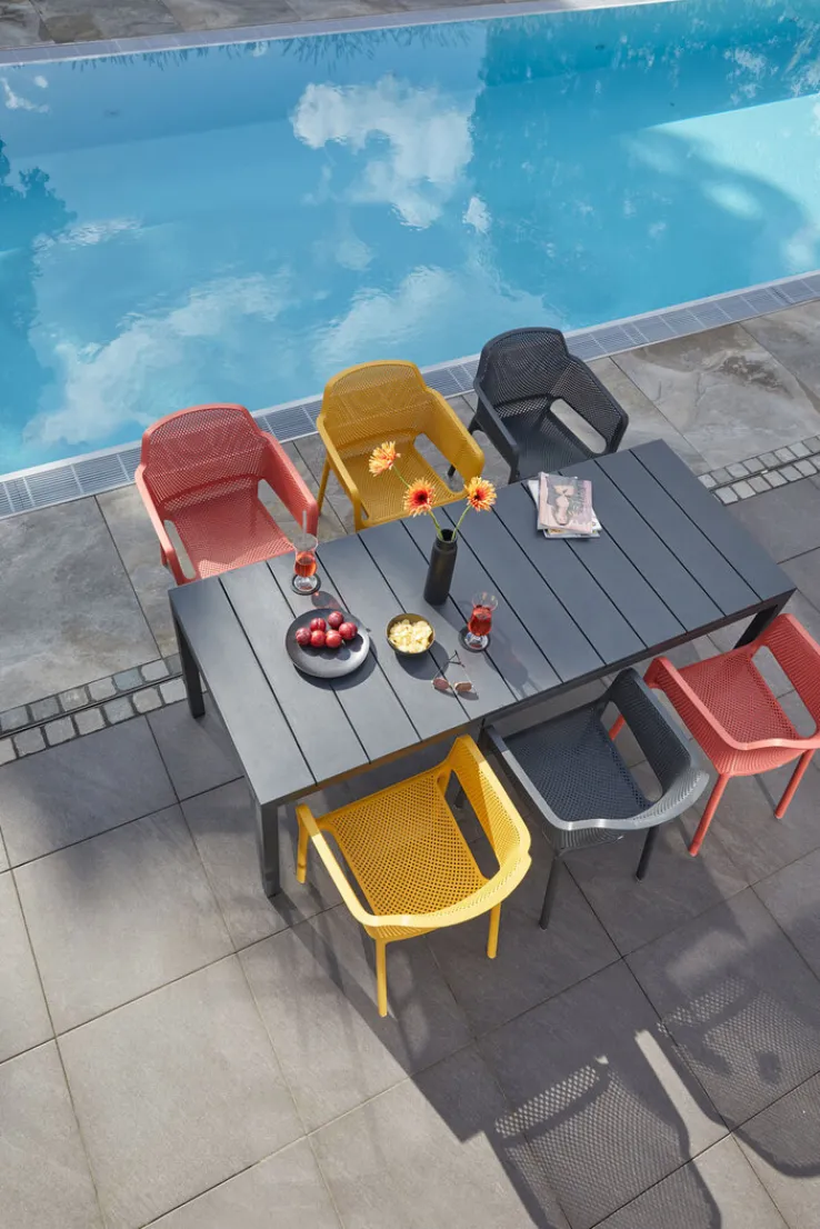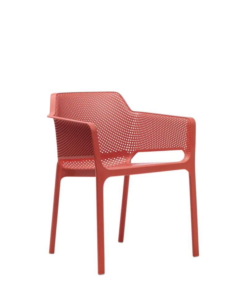 Mit dem NARDI Dining Gartenstuhl NET AL in farbenfrohem Corallo lassen sich Balkon, Terrasse und Garten mit einem farbenfrohen Blickfang ausstatten, der zudem mit gutem Sitzkomfort glänzt.