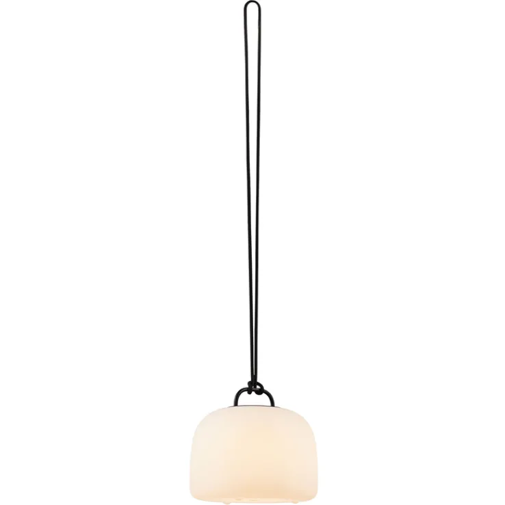 Die Akku LED Hängeleuchte KETTLE von Nordlux eignet sich optimal für den flexiblen Outdoor-Einsatz: Nutzer platzieren diese Leuchte mit schwarzer Aufhängung aus Metall und weißem, 22 cm breitem Schirm aus Kunststoff bequem auf dem Balkon, der Terrasse oder im Pavillon.