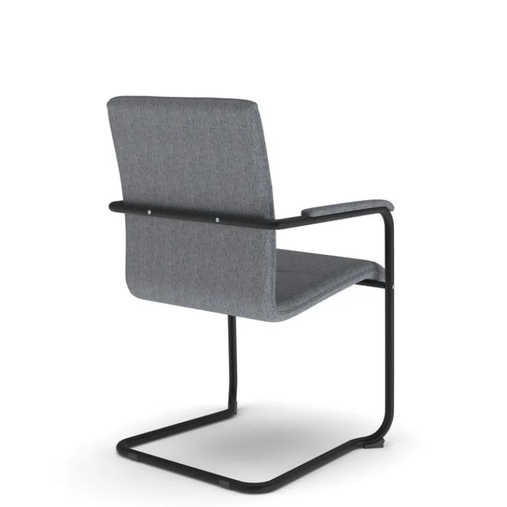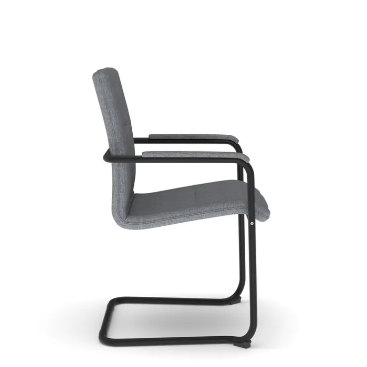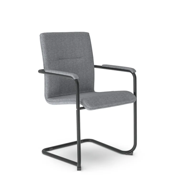 Durch die geschwungene Form des Gestells federn die gut gepolsterte Sitzfläche und die Rückenlehne leicht nach. So gestaltet sich das Sitzen auf dem Besucherstuhl äußerst komfortabel. Im privaten Bereich ist das Möbelstück in Fluren gut aufgehoben. Weiterhin kann es Patienten in Praxisräumen als bequeme Sitzlösung angeboten werden. Das metallische Gestell ist gepulvert und daher korrosionsbeständig – der Stoffbezug robust.