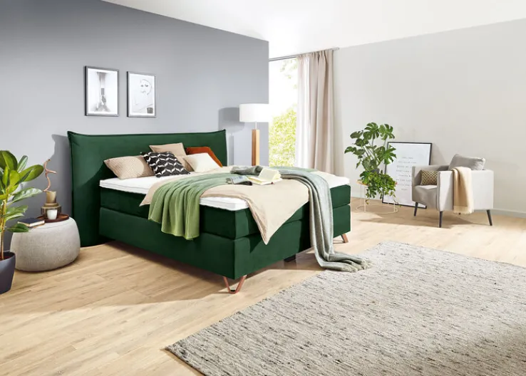Für das Boxspringbett FENSON OSLO NV lässt die Marke Ole Gunderson skandinavisches Design auf hohen Komfort treffen. Ausgestattet ist das bequeme Doppelbett mit zwei hochwertigen Taschenfedernkern-Matratzen der mittelfesten Härtegrade H2 und H3. Der Topper aus Latex passt sich der individuellen Körperkontur an und bietet einen guten Druckausgleich. Während das Bett vorn vom geraden Kopfteil getragen wird, stützen es am Fußende zwei konisch geformte Metallfüße ab, deren kupferfarbige Optik optimal zum waldgrünen Textilbezug harmoniert.