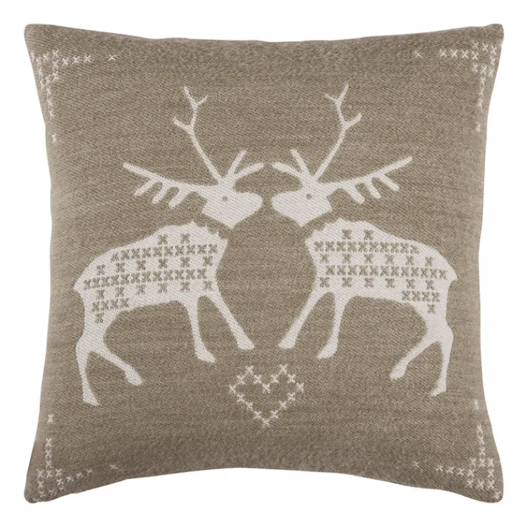 Dieses dekorative Kissen in der Größe 45 x 45 cm besticht durch sein modernes Design und die rechteckige Form. Der Bezug ist in einem sandfarbenen Beige gehalten, das sich harmonisch in verschiedene Wohnstile einfügt. Das auffällige Muster zeigt zwei stilisierte Rentiere, die sich gegenüberstehen, und verleiht dem Kissen einen charmanten, winterlichen Charakter. Gefertigt aus einer Mischung von Naturmaterialien und Kunststoffen, bietet der Bezug eine angenehme Haptik. Dieses Kissen eignet sich ideal, um Ihrem Wohnraum eine gemütliche und stilvolle Note zu verleihen.