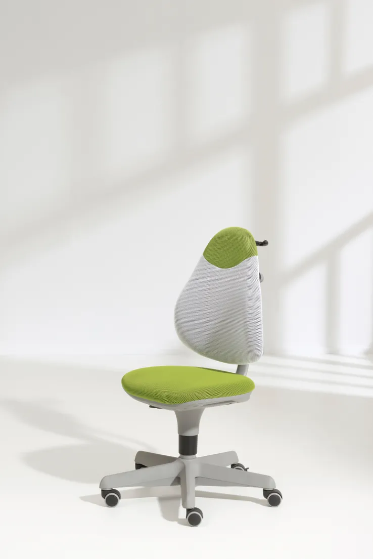 Der PAIDI Drehstuhl PEPE ist mit einem waschbaren Sitz- und Rückenlehnenbezug in Grün/Weiß ausgestattet und besitzt ein darauf abgestimmtes silberfarbenes Gestell mit stabilem Fußkreuz. Die ergonomisch geformte und in der Tiefe verstellbare Lehne entlastet den Rücken und die leicht nach unten gewölbte Sitzfläche bietet einen angenehmen Sitzkomfort. Der Sitz kann stufenlos in der Höhe reguliert werden.
