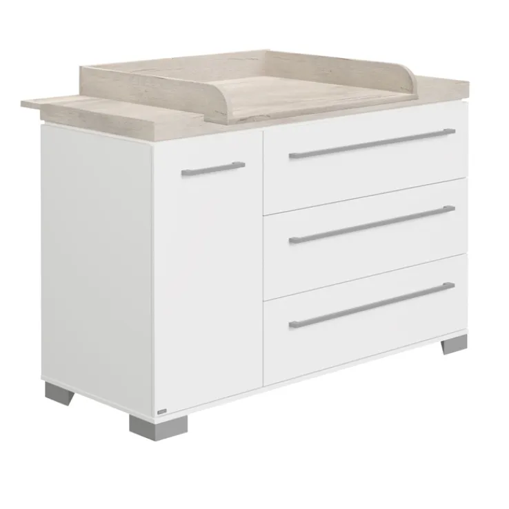 Die PAIDI Wickelkommode präsentiert sich in einem eleganten Kreideweiß. Sie ist ausgestattet mit einer Drehtür und drei Schubkästen.