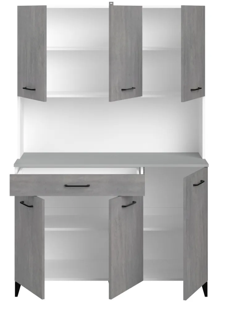 Eine Küche muss perfekt organisiert sein. Dabei hilft das PARISOT Buffet Malice 2. Es sorgt dafür, dass immer Ordnung herrscht und wichtige Utensilien stets zur Hand sind. Hinter sechs Drehtüren mit schwarzen Griffen verbergen sich geräumige Aufbewahrungsfächer. Töpfe, Pfannen, Schüsseln und Geschirr finden hier Platz. Die breite Schublade ist für Bestecke, Küchenmesser und -helfer vorgesehen. Außerdem gibt es eine großzügige Ablage für Küchengeräte. Korpus und Fronten bestehen aus Holznachbildung und Melaminharz, Füße und Griffe aus Kunststoff.