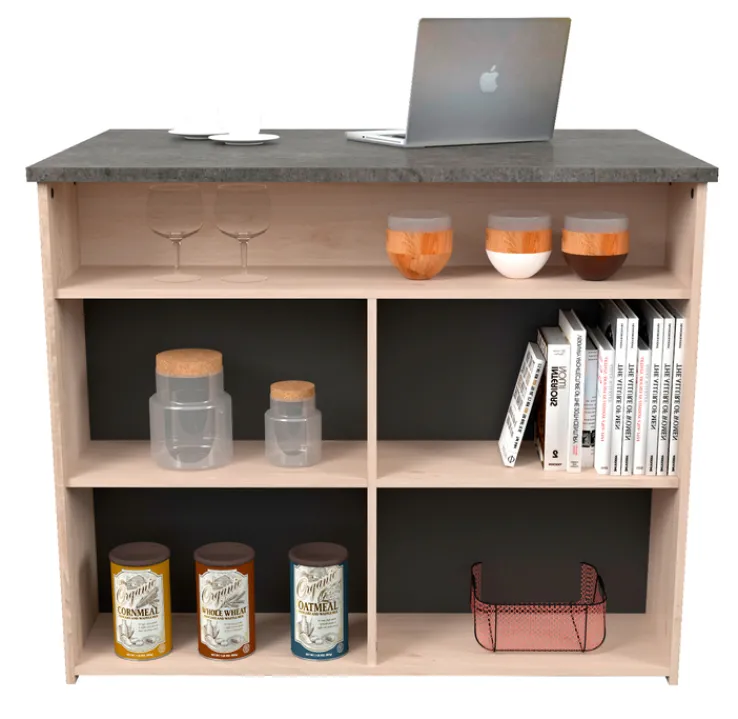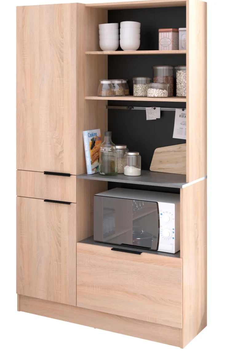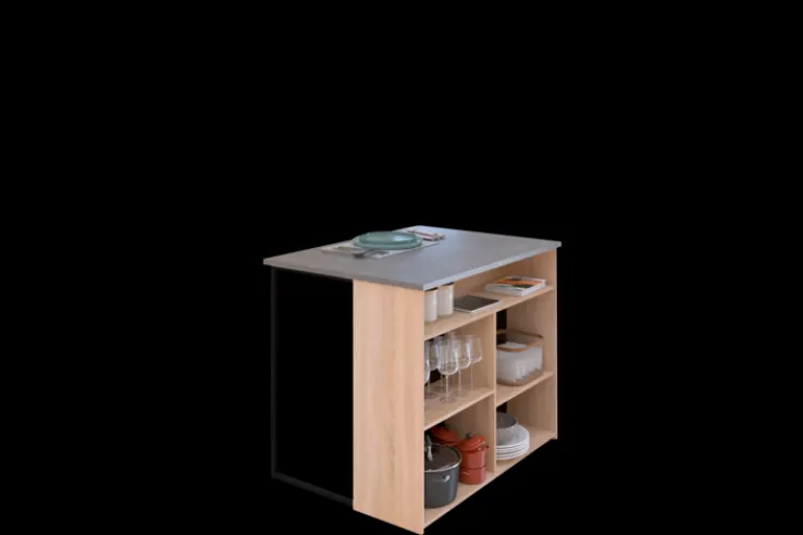 Das Parisot Küchenbuffet Fumay3 enthält ein großes Buffet, eine Kücheninsel sowie einen kompakten Beistellschrank auf Rollen. Mit der Kombination aus Holzdekor, schwarzem Metall und Arbeitsplatten in Beton Dekor liegen die Küchenmöbel optisch genau im Trend. Die Oberfläche sind für eine verbesserte Strapazierfähigkeit mit Melaminharz beschichtet. Zusätzlich zur hohen Qualität und stylischem Look bietet das Küchenbuffet in zahlreichen offenen und geschlossenen Fächern jede Menge Platz für Töpfe, Geschirr und vieles mehr.