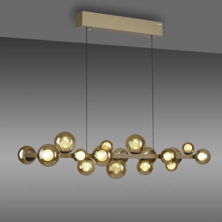 Die LED Pendelleuchte E-POPUP besteht aus 18 Glaskugeln, von denen die größeren amberfarbig getönt und die kleineren satiniert sind. In jeder Kugel befindet sich eine 1,8 Watt starke, fest eingebaute LED. Mit zusammen rund 32 Watt erreichen die LEDs eine Lichtleistung von 3.888 Lumen. Die Helligkeit ist dimmbar und die Farbtemperatur von 2.700 bis 5.000 Kelvin (Warmweiß bis Neutralweiß) justierbar. Eine Memory-Funktion ist vorhanden. Außerdem verfügt die Hängelampe über einen E-Lift(R)-Antrieb, der eine Einstellung der Höhe zwischen 45 und 240 cm erlaubt.