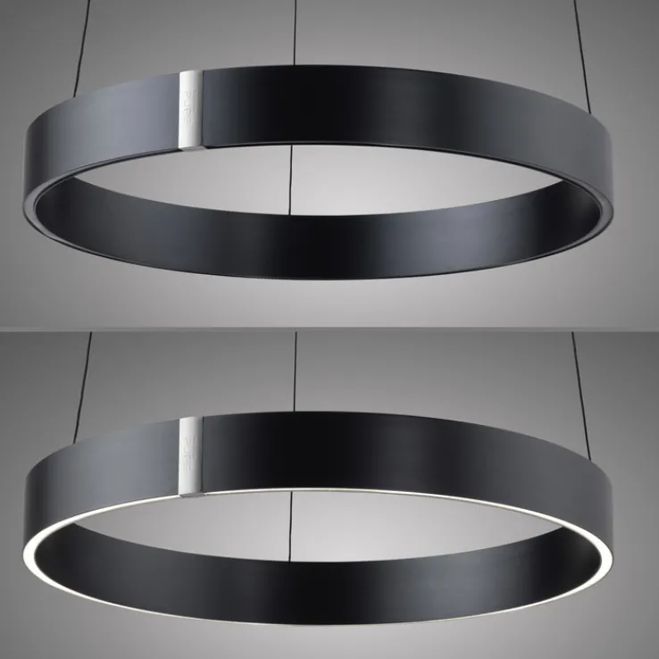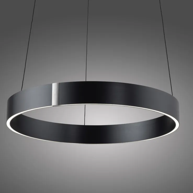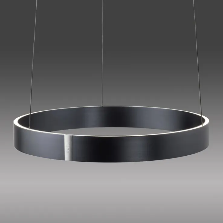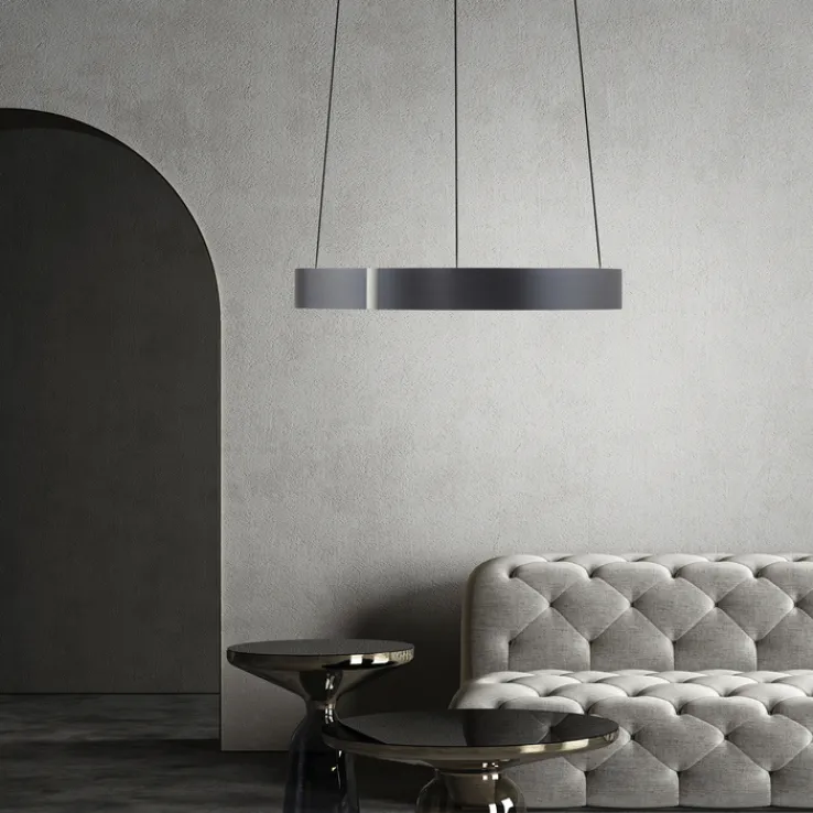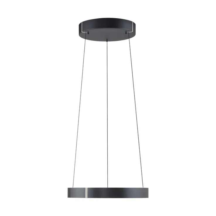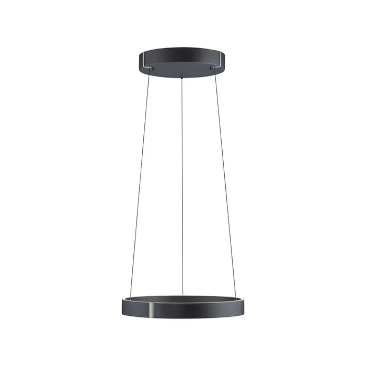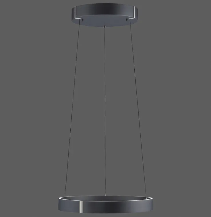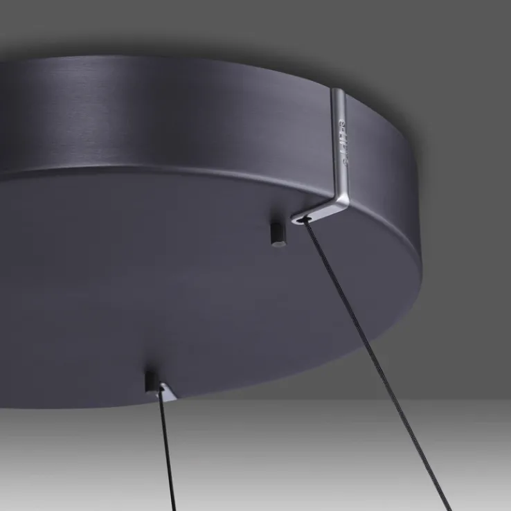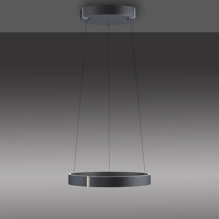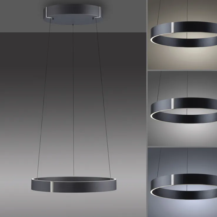 Die graue LED-Pendelleuchte PURE E-CLIPSE mit einem Durchmesser von 50 cm beeindruckt mit ihrer technischen Ausstattung: So lassen sich mit der mitgelieferten Fernbedienung die Höhe und die Farbtemperatur dieser Leuchte aus Metall verstellen.