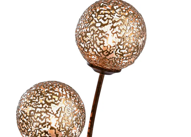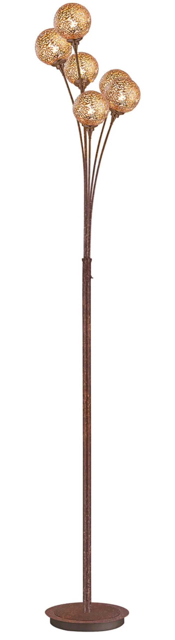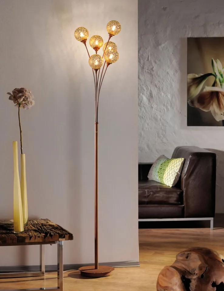 Diese dekorative Stehlampe GRETA in rostfarbig mit sechs goldfarbigen Kugeln passt hervorragend zu Einrichtungen im Landhaus Stil.