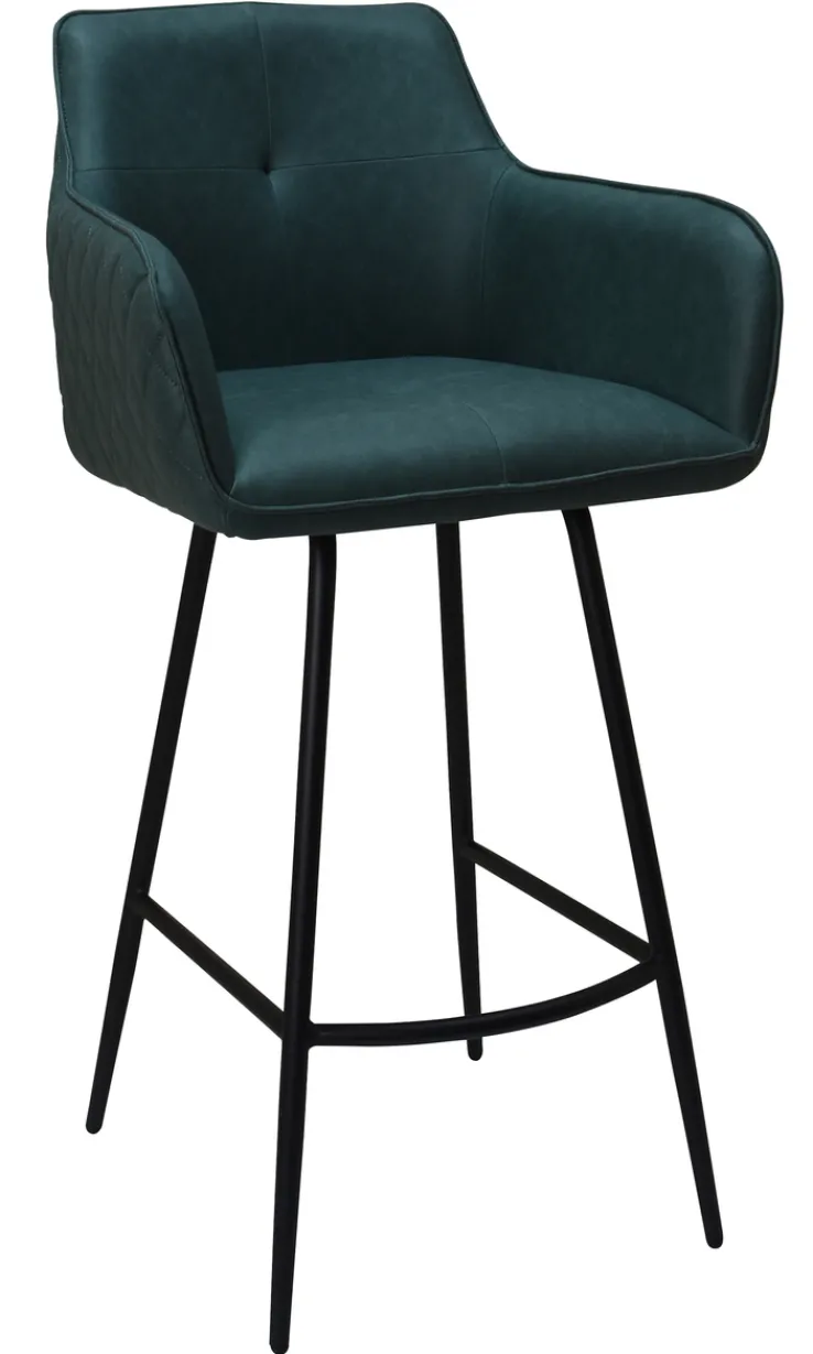 Das Vierfußgestell aus schwarzem Metall verleiht dem Barhocker Stabilität und einen zeitgemäßen Look. Die Sitzfläche und Rückenlehne sind mit einem weichen, grünen Textil bezogen, das nicht nur optisch ansprechend ist, sondern auch für zusätzlichen Komfort sorgt. Die dezente Steppung an den Seiten der Rückenlehne unterstreicht das moderne Design. Dieser Barhocker ist ideal für Kücheninseln oder Bartheken und fügt sich nahtlos in verschiedene Einrichtungsstile ein.