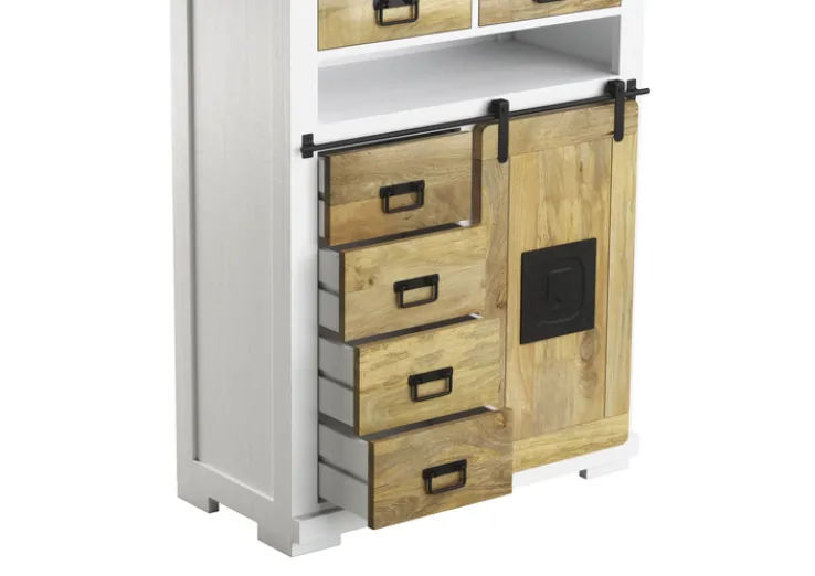 Optisch begeistert das Highboard mit seiner ansprechenden Farbkombination aus braun und weiß lackiertem Mangoholz und den schwarz lackierten Metallapplikationen. Es ist mit einer praktischen Schiebetüren, einem geräumigen Ablagefach in der Mitte und sechs Schubladen ausgestattet. Im Wohn- und Schlafzimmer ist es ein optisch attraktives und funktionales Möbelstück.