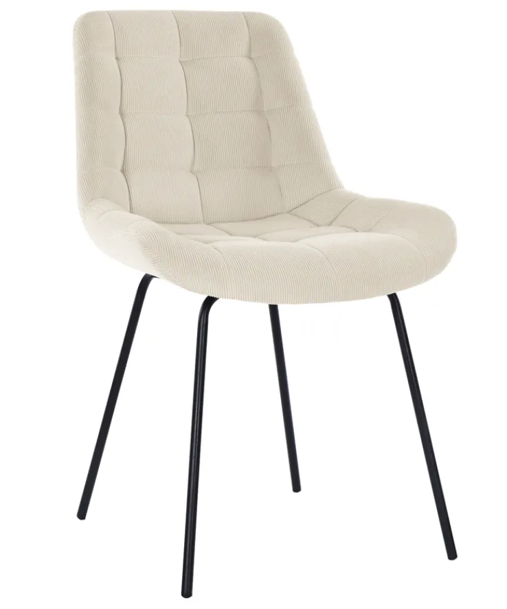 Ein Stuhl im modernen Stil mit einem cremefarbig-beigen Cord-Bezug plus einem stabilen Vierfußgestell aus schwarz pulverbeschichtetem Metall – das ist der Stuhl OLIVIA von PHILL HILL. Die Sitzhöhe des Stuhls beträgt 49,0 cm, die Breite 50,0 cm, die Gesamthöhe 79,0 cm und die Tiefe 61,0 cm.