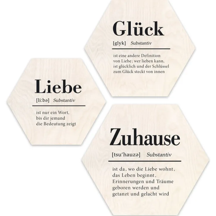 ZUHAUSE GLÜCK LIEBE II heißt das Bilder Set, das zum Nachdenken anregt. Die drei Hartschaumpaneele in Form verschieden großer Hexagons können nach Belieben neben- oder übereinander angeordnet werden. Ein doppelseitig klebbares Aufhängesystem ist in die Platten integriert. Es dient gleichzeitig als Abstandhalter von der Wand und sorgt so für eine besonders ansprechende Optik.
