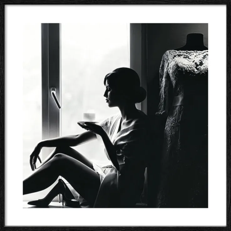 Das stimmungsvolle Framed-Art Bild LADY DRINKING COFFEE ist in Schwarz-Weiß mit grauen Schattierungen gehalten und misst 33 x 33 cm, bei einer Tiefe von 1,8 cm. Passend zur farblichen Gestaltung des Kunstwerks präsentiert sich auch der mitgelieferte quadratische Holzrahmen in Schwarz.