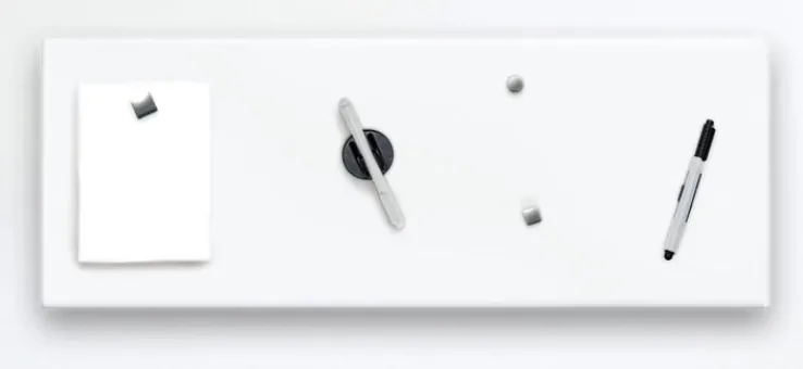 Das PRO ART Memoboard mit den Maßen 80 x 30 cm präsentiert sich in Weiß. Sie erhalten mit der Lieferung 1 Memoboard, 1 Stift und 4 Magnete.