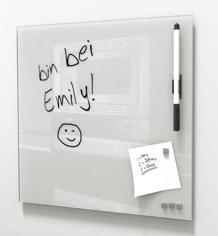 Das Memoboard ist weiß und quadratisch, es besteht aus Metall. Der Artikel ist ein 6-teiliges Set mit einem Memoboard, einem Stift und 4 Magneten. Es ist eine sehr praktische Erinnerungshilfe für den Alltag. Das Memoboard kann in der Küche oder über den Schreibtisch angebracht werden und hilft dabei, den Tagesablauf besser zu strukturieren. Wichtige Artikel, Fotos oder Erinnerungszettel können dank der Magneten am Board angebracht werden. Das Memoboard ist selbstverständlich in weiteren Ausführungen erhältlich.