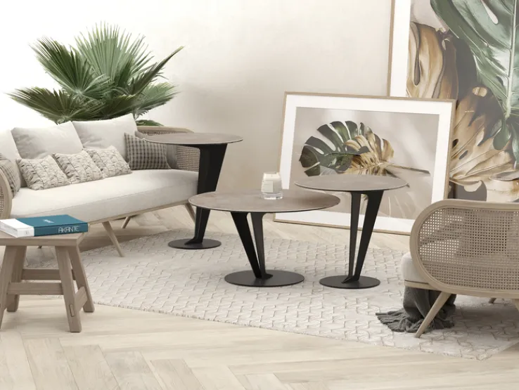 Das Gestell des Tisches ist aus lackiertem Stahl gefertigt und verfügt über eine matte Optik, die dem Tisch eine moderne Note verleiht. Der Tellerfuß sorgt für einen sicheren Stand und unterstreicht das minimalistische Design. Der Tisch ist ideal für den Einsatz in modernen Wohnräumen geeignet und fügt sich nahtlos in verschiedene Einrichtungsstile ein. Mit einem Gewicht von 18 kg ist er stabil und dennoch leicht genug, um bei Bedarf umgestellt zu werden.