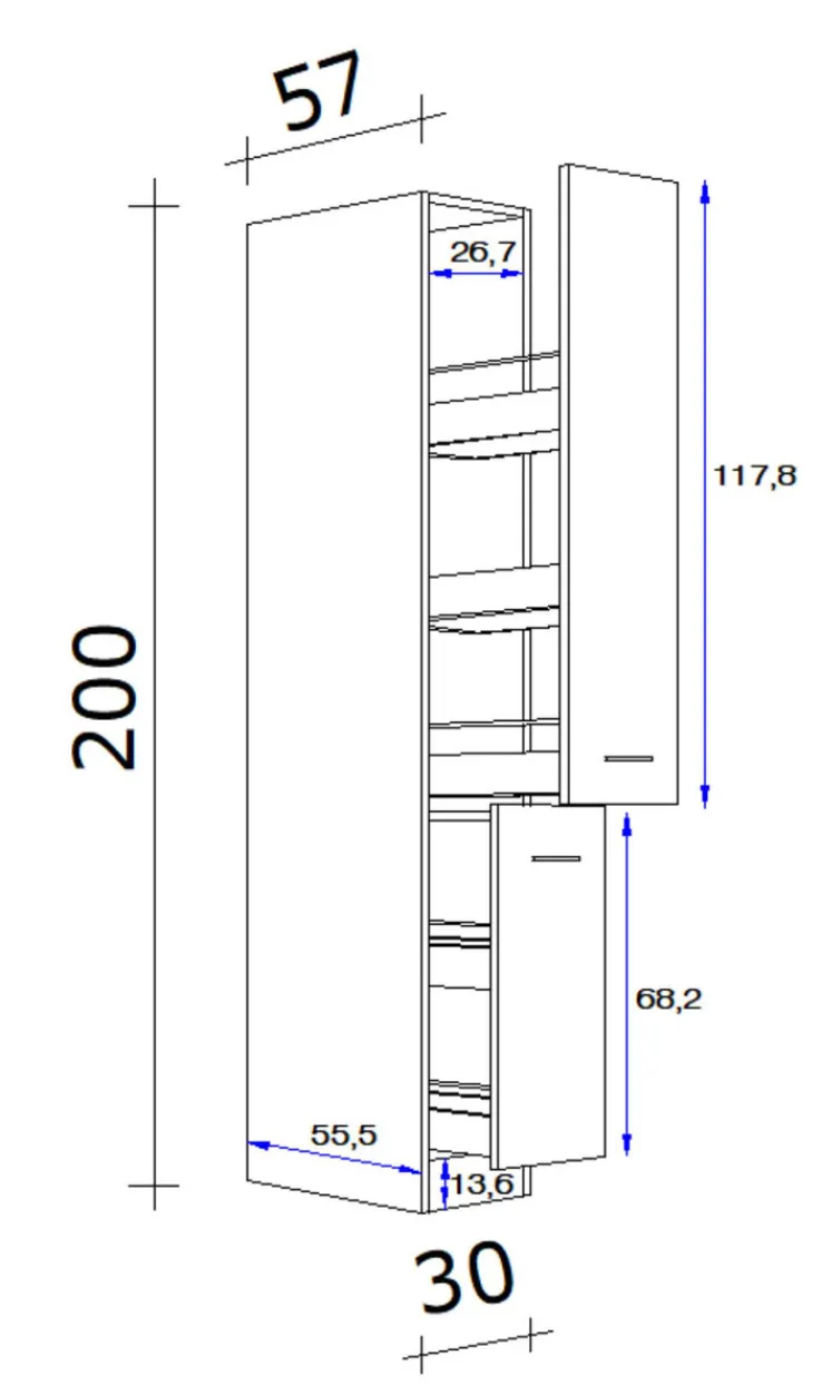 Der geräumige Apothekerschrank RALPH hat eine Größe von 30 x 200 x 30 cm und wird in Deutschland aus robuster MDF-Platte gefertigt. Während der Korpus in einem eleganten Eicheton gehalten ist, sind die Auszüge in einem stylischen Grau gehalten. Dank der Beschichtung mit Melaminharz hält der Apothekerschrank der täglichen Beanspruchung problemlos stand. Hinter den Auszügen, die getrennt voneinander geöffnet werden können, befinden sich insgesamt fünf Ablageflächen. Die Ablageflächen sind mit Seitenwänden ausgestattet, die für optimale Sicherheit sorgen.