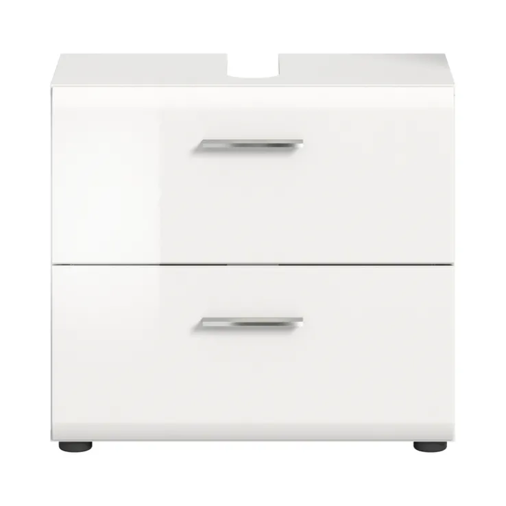 Der praktische Bad-Waschbeckenunterschrank LOGAN überzeugt mit seinen glänzenden weißen Oberflächen. Er bietet Platz für alles, was griffbereit unter dem Waschbecken sein soll. Waschbeckenunterschränke erfüllen zwei wichtige Aufgaben. Zum einen verdecken sie das Abflussrohr und sorgen für ein schönes Badambiente. Zum anderen stellen sie eine wichtige Aufbewahrungsmöglichkeit dar. Der Bad-Waschbeckenunterschrank LOGAN aus Holznachbildung ist mit zwei Schubkästen ausgestattet. Sie lassen sich bequem mit den silberfarbigen Griffleisten aus Kunststoff öffnen. Mit einem Handgriff sind Handtücher, Utensilien oder Produkte für die Haut- und Haarpflege erreichbar. Ein Waschbeckenunterschrank ist ein wichtiges Möbelstück für kleine Bäder, da er den Platz unter dem Waschbecken optimal nutzt.