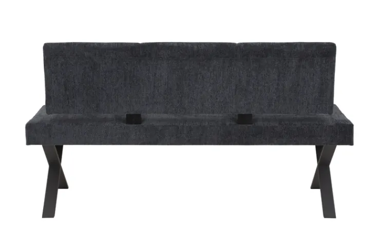 Das X-Gestell und der Unterbau der Bank MARION I bestehen aus Metall. Die Oberflächen sind pulverbeschichtet. Die weichen Polster sind mit einem strapazierfähigen Webstoff bezogen. Die Bank ist bis 300 kg belastbar.